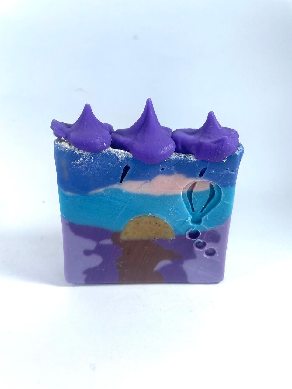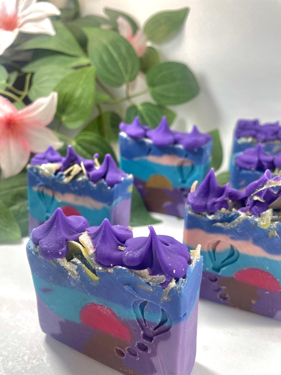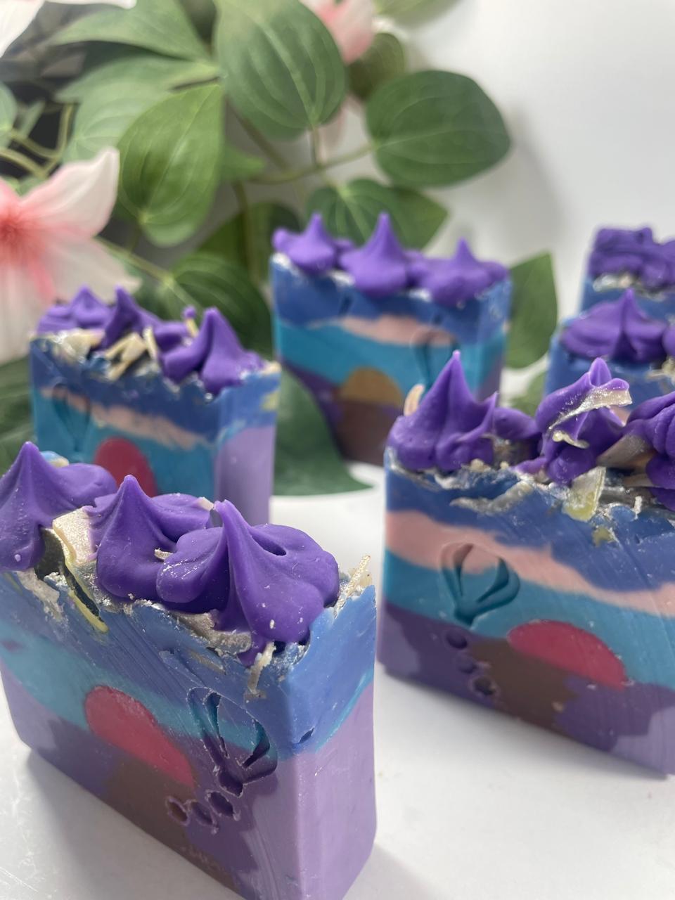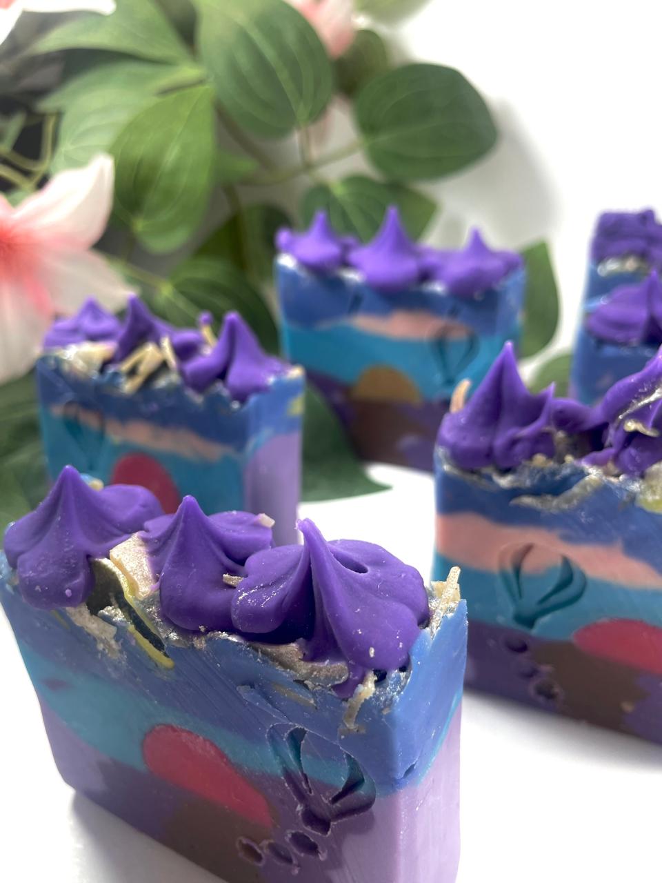 Ingredientes: Aceite de Coco, Aceite de Oliva, Aceite de Ricino, Aceite Esencial de Lavanda, Agua Destilada, Lejía (después de la saponificación, la lejía no está presente en la barra terminada), Micas como colorantes naturales seguros para la piel.