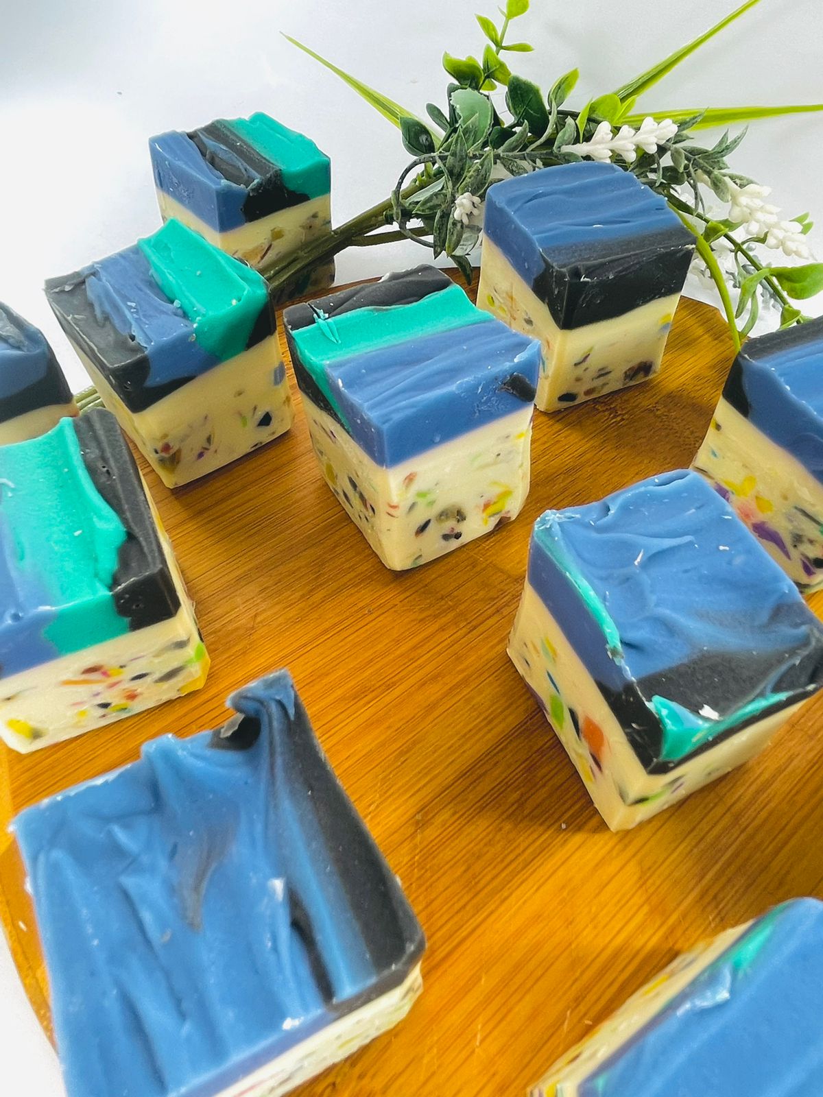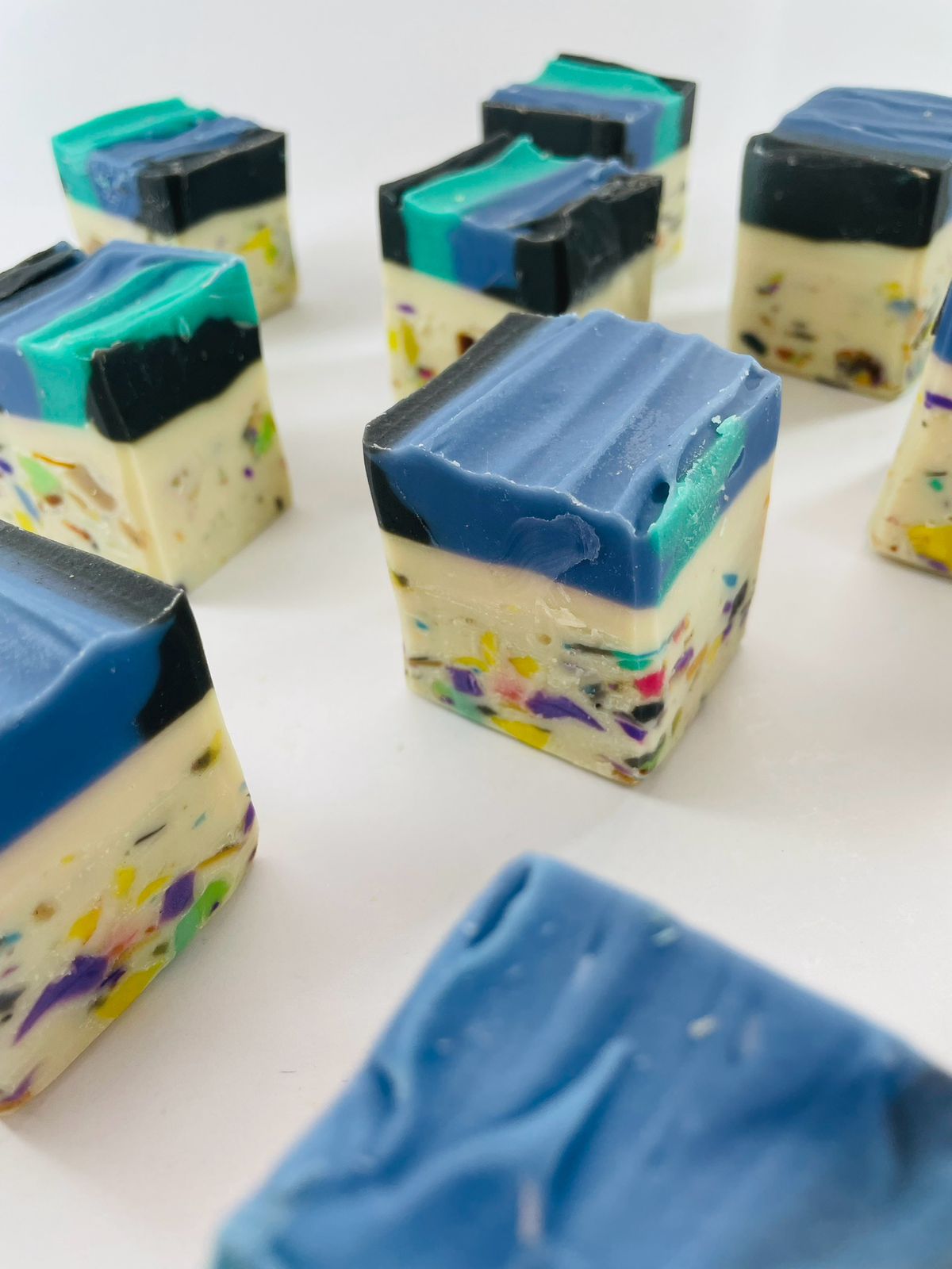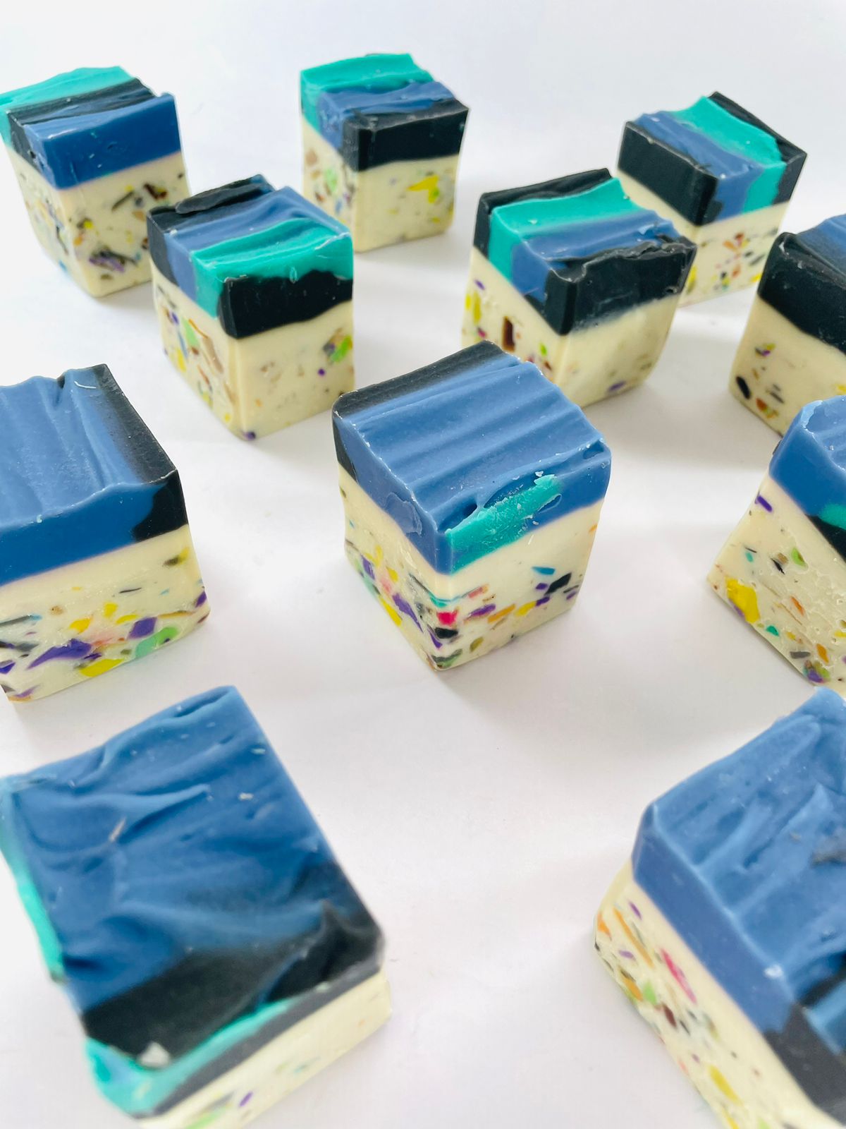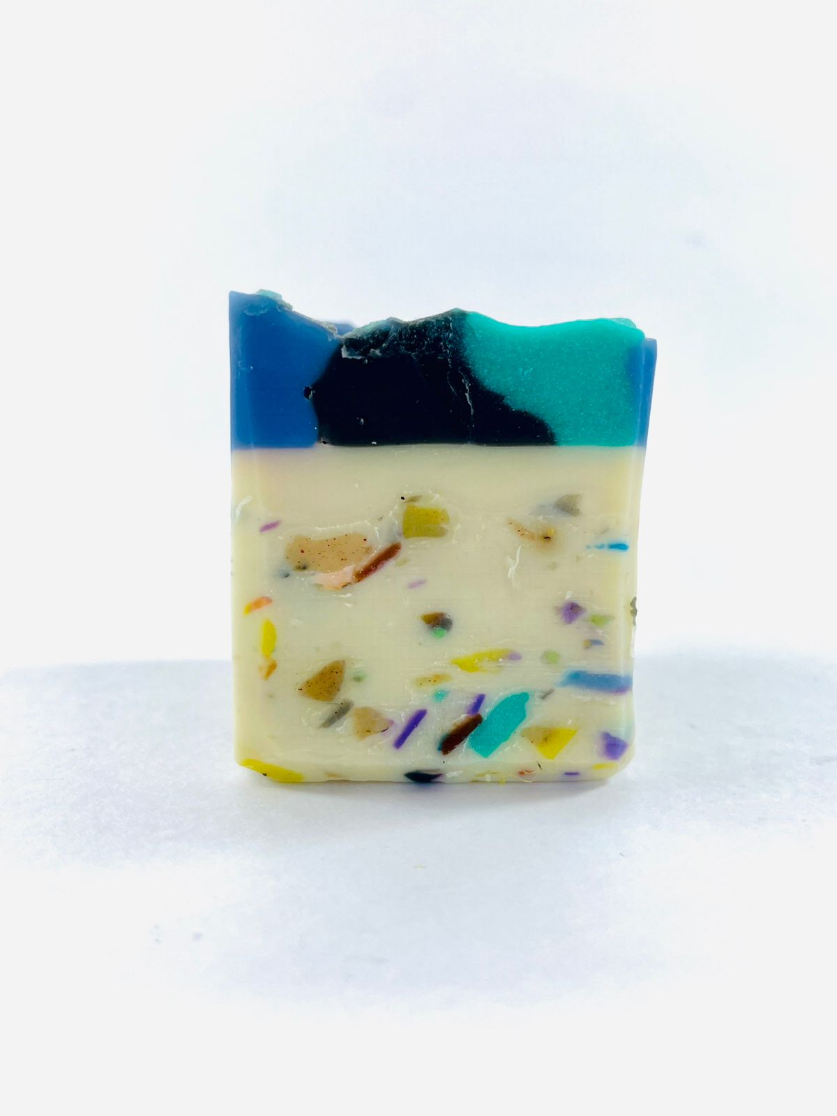 Ingredientes: Aceite de Coco, Aceite de Oliva, Aceite de Almendra Dulce, Aceite de Ricino, Aceite Esencial de Pomelo, Agua Destilada, Lejía (no presente en el producto final tras la saponificación), Micas naturales para un diseño seguro para la piel.