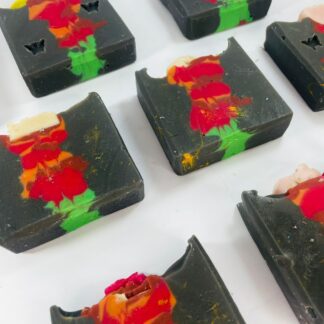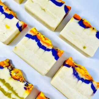 Ingredientes: Aceite de Coco, Aceite de Oliva, Aceite de Ricino, Aceite Esencial de Tea Tree, Agua Destilada, Lejía (después de la saponificación, la lejía no está presente en la barra terminada), Micas como colorantes naturales seguros para la piel.