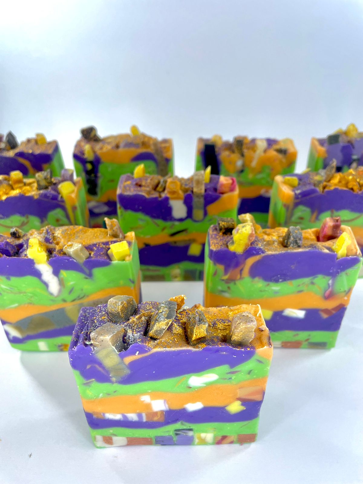 Ingredientes: Aceite de Coco, Aceite de Oliva, Aceite de Ricino, Aceite Esencial de Tea Tree, Agua Destilada, Lejía (después de la saponificación, la lejía no está presente en la barra terminada), Micas como colorantes naturales seguros para la piel.